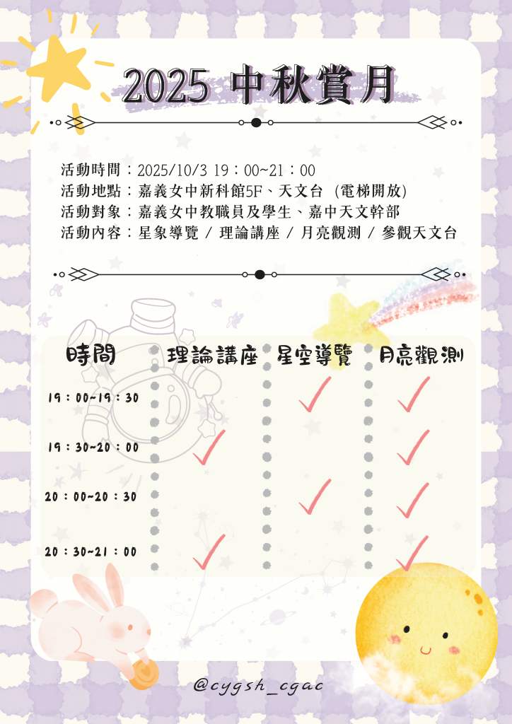 大家好,一年一度的中秋天文活動又來了~~ 時間是114.10.3(五),19:00~21:00